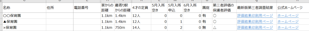 アクセス、空き状況、園庭の有無、ホームページのリンク、等をリスト化しました。